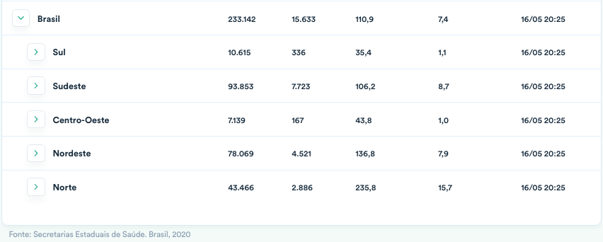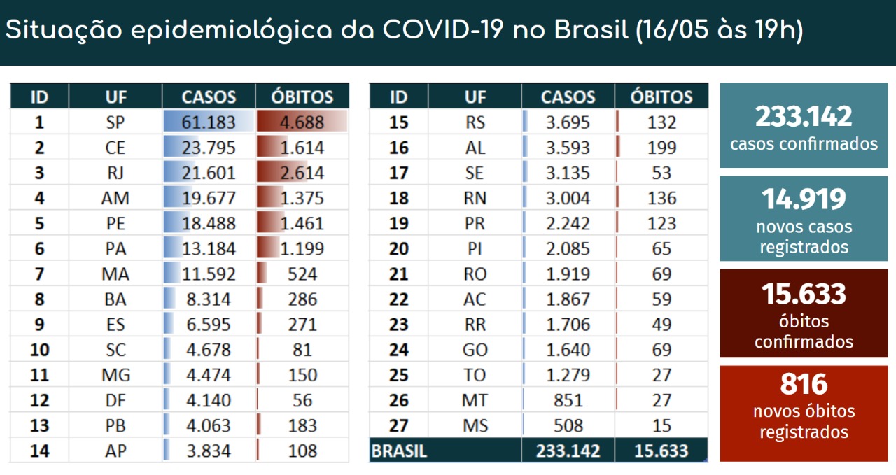 Dados do Ministério da Saúde (MS), deste sábado (16/Mai), apontam um total de 233.142 casos por coronavírus (Covid-19), além de contabilizar 15.633 óbitos pela Covid-19 em todo país. Nas últimas 24 horas, o MS aponta o registro de 14.919 casos e 816 mortes.