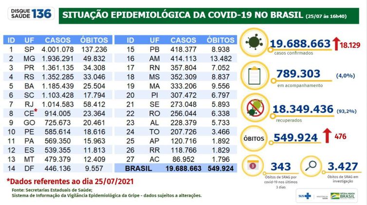 O Brasil já tem oficialmente registradas 549.924 mortes em decorrência da covid-19 e 19.688.663 casos notificados. Desse total, 18.349.436 pessoas se recuperaram da doença. Os dados foram divulgados no início da noite deste domingo (25) pelo Ministério da Saúde, tendo como base informações disponibilizadas pelas secretarias estaduais de Saúde. Nas últimas 24 horas foram contabilizados 476 óbitos e 18.129 novos casos de pessoas contaminadas.