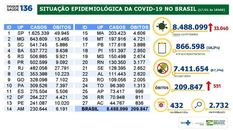 Ainda de acordo com a atualização do Ministério da Saúde, os casos de covid-19 totalizam 8.488.809. Nas últimas 24 horas, foram registrados 33.040 novos diagnósticos. Ontem, o painel de estatísticas marcava 8.455.059 casos acumulados.
