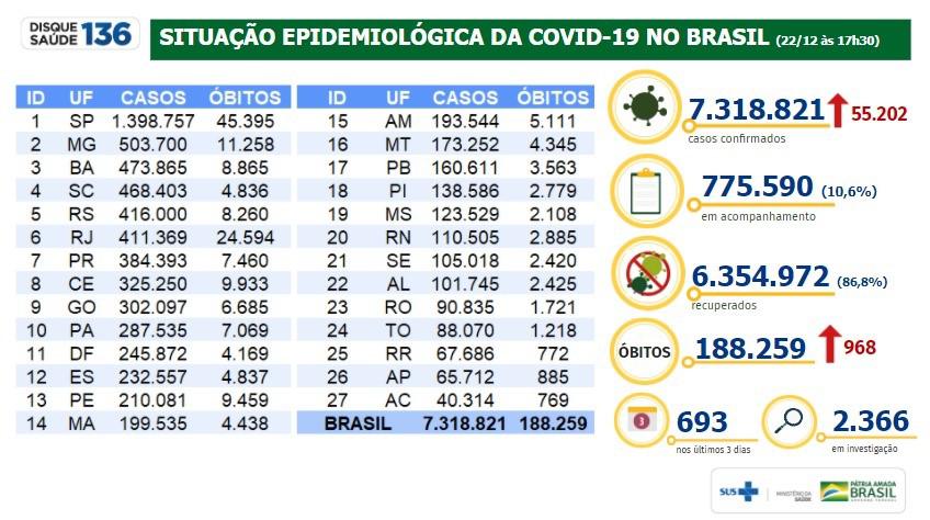O balanço divulgado nesta terça-feira (22) pelo Ministério da Saúde registra 55.202 novos casos de covid-19 nas últimas 24 horas. Já são 7.318.821 casos desde o início da pandemia. De ontem para hoje (22), foram registradas 968 mortes, totalizando 188.259 óbitos.