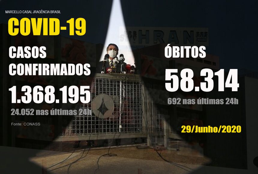 De acordo com consolidação de dados do Conselho Nacional dos Secretários de Saúde (CONASS), desta segunda-feira (29/Jun), o Brasil contabiliza 58.314 óbitos, por Covid-19, além de um total de 1.368.195 casos confirmados de pessoas infectadas pelo coronavírus no país.