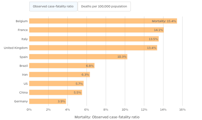 O índice de letalidade no Brasil, por sua vez, chega a 8,1% das pessoas confirmadas para a Covid-19. O país, atualmente, alcançou a 6a posição no ranking mundial, atrás da Espanha com 10,2%, Reino Unido (13,4%), Italia (13,5%), França (14,1% e Bélgica (15,4%), de acordo com levantamentos do Coronavírus Resource Center (CRC), da Johns Hopkins University & Medicine (27/Abr)(Veja Aqui).