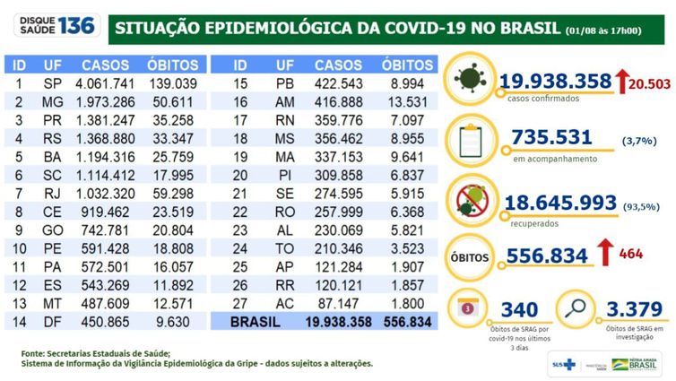 Dados do Ministério da Saúde mostram que, em 24 horas, 20.503 pessoas foram diagnosticadas com covid-19 e 464 pessoas morreram da doença.