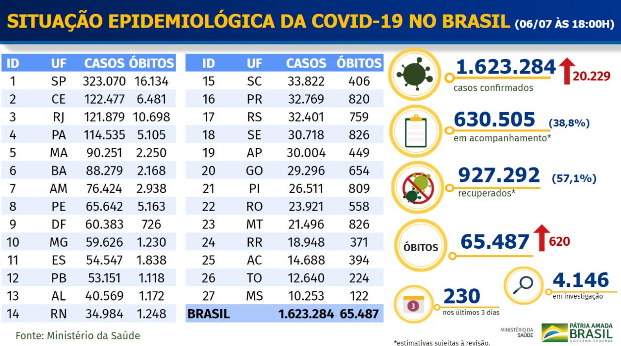 Pelas estatísticas do Ministério da Saúde, foram identificados mais 20.229 casos da doença. Com isso, o número total de pessoas infectadas chegou a 1.623.284. Ontem, o painel do Ministério da Saúde mostrava 1.603.555 casos confirmados.
