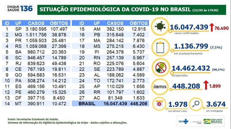 Os dados contabilizados pelo ministério são divulgados pelas secretarias estaduais de saúde diariamente. Do total de pessoas que adoeceram, 14.462.432 (ou cerca de 90%) já são consideradas recuperadas, enquanto 1.136.799 (7%) continuam sendo acompanhadas. Há, ainda, outros 3.674 casos suspeitos esperando resultados de exames laboratoriais.