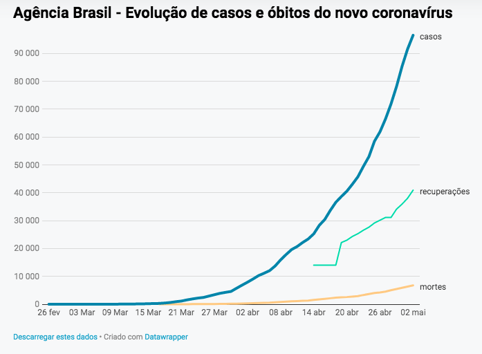 O Ministério da Saúde divulgou hoje (2) novos números sobre a pandemia do novo coronavírus (covid-19) no país. De acordo com levantamento diário feito pela pasta, o Brasil tem 96.559 casos confirmados da doença e 6.750 mortes foram registradas. A taxa de letalidade está em 5,1%. Nas últimas 24 horas, o ministério registrou 4.970 novos casos e 421 mortes.
