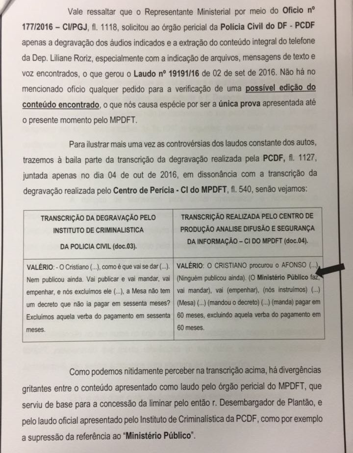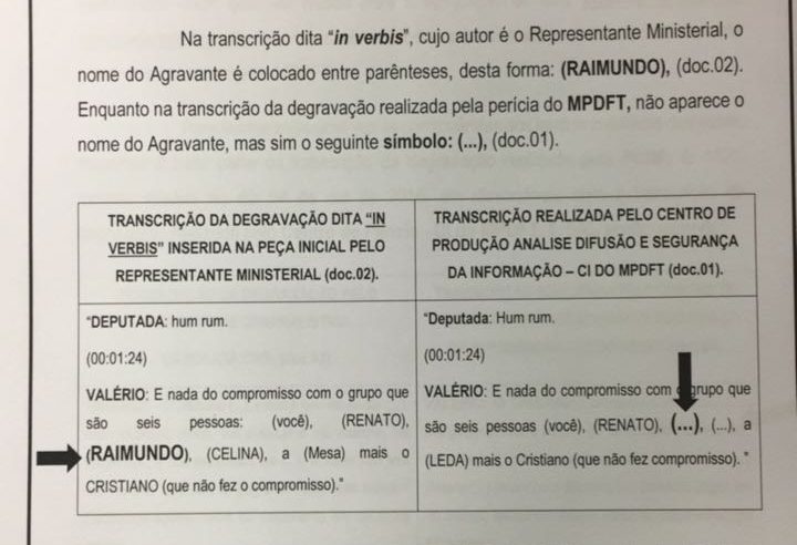 Nos dois casos – relatório da Policia Civil e do Ministério Público – identifica-se conflito entre a transcrição feita pelo Ministério Público e a da Polícia Civil. O Ministério Público engendrou um enredo para incriminar os deputados da Mesa Diretora. A perícia policial foi feita 17 dias após os grampos terem ficado sob os cuidados do MP. Período suficiente, atestam profissionais de segurança da informação, para a ocorrência de supressões, enxertos etc.