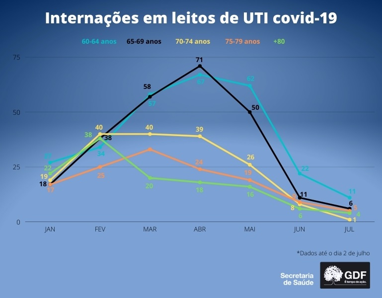 A Secretaria de Saúde (SES) vem registrando queda nas internações de idosos nas unidades de terapia intensiva (UTIs) da rede pública. Os dados contabilizados até o dia 2 deste mês mostram que todas as faixas etárias acima de 60 anos apresentaram queda a partir de maio. A redução está associada diretamente ao início do processo de vacinação no Distrito Federal.