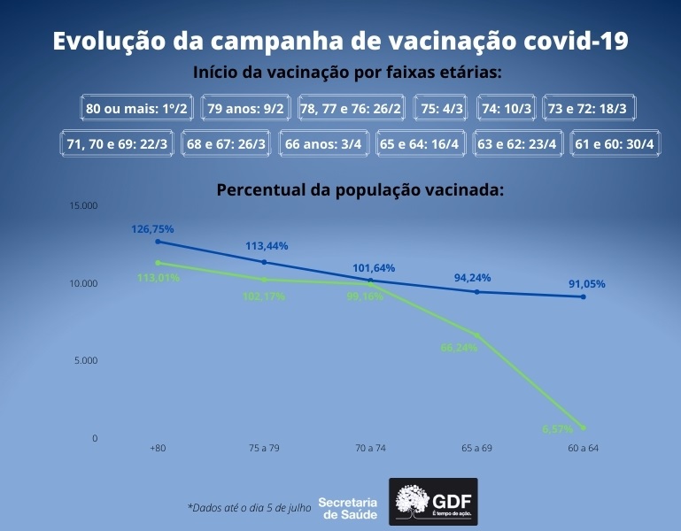 Durante todo o mês de julho, receberão a segunda dose 224.946 indivíduos, dos quais 196 mil iniciaram o esquema vacinal em abril, com a AstraZeneca. A maioria desse público é de idosos entre 60 e 66 anos, o que justifica o baixo percentual de pessoas nessas idades vacinados, conforme o gráfico de vacinação (veja acima).