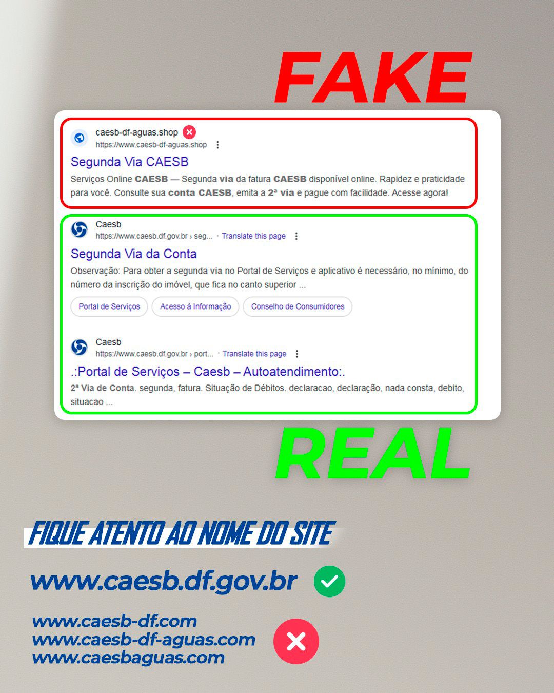 A Companhia de Saneamento Ambiental do Distrito Federal (Caesb) informa que portais falsos estão usando a página de apresentação do site oficial da empresa para aplicar golpes em clientes. Dessa forma, os clientes geram a segunda via da conta e efetuam o pagamento para outros locais.