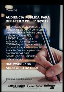 Devem participar da audiência pública, requerida pelos deputados distritais Telma Rufino (PSB), Wellington Luiz (PMDB) e Celina Leão (PPS), representantes da CODHAB, Tribunal de Contas do DF (TCDF), Ministério Público do DF e Territórios (MPDFT) e do Movimento Moradia.