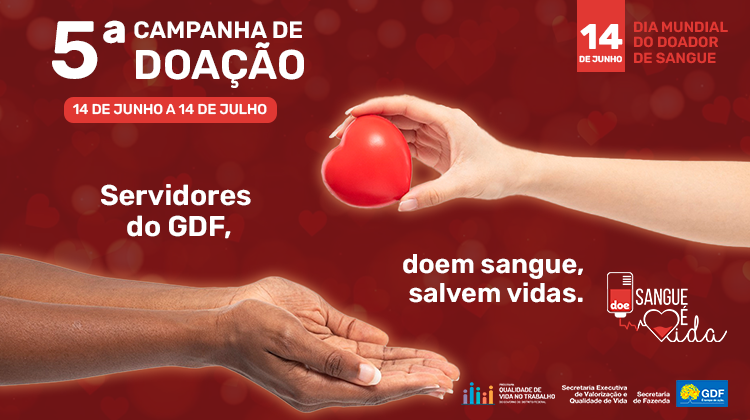 No Dia Mundial do Doador de Sangue, 14 de junho, a Secretaria Executiva de Valorização e Qualidade de Vida da Secretaria de Fazenda (Sefaz) em parceria com a Fundação Hemocentro de Brasília (FHB) lançará a 5ª edição da Campanha Sangue é Vida, que ocorrerá até o dia 14 de julho.