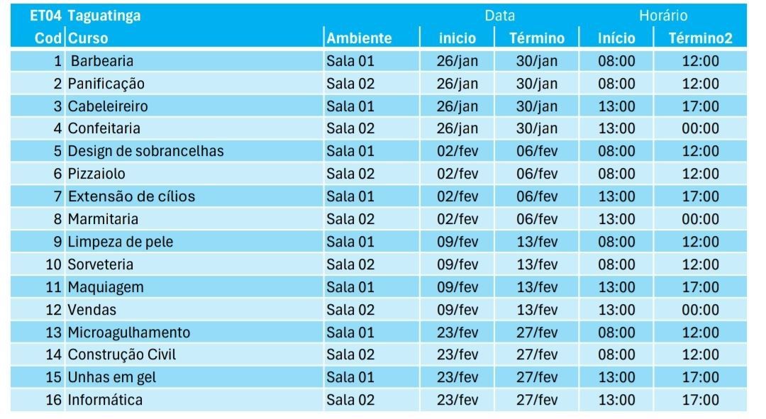 Os cursos têm duração média de cinco dias, com turmas pela manhã e à tarde, conforme o cronograma abaixo: