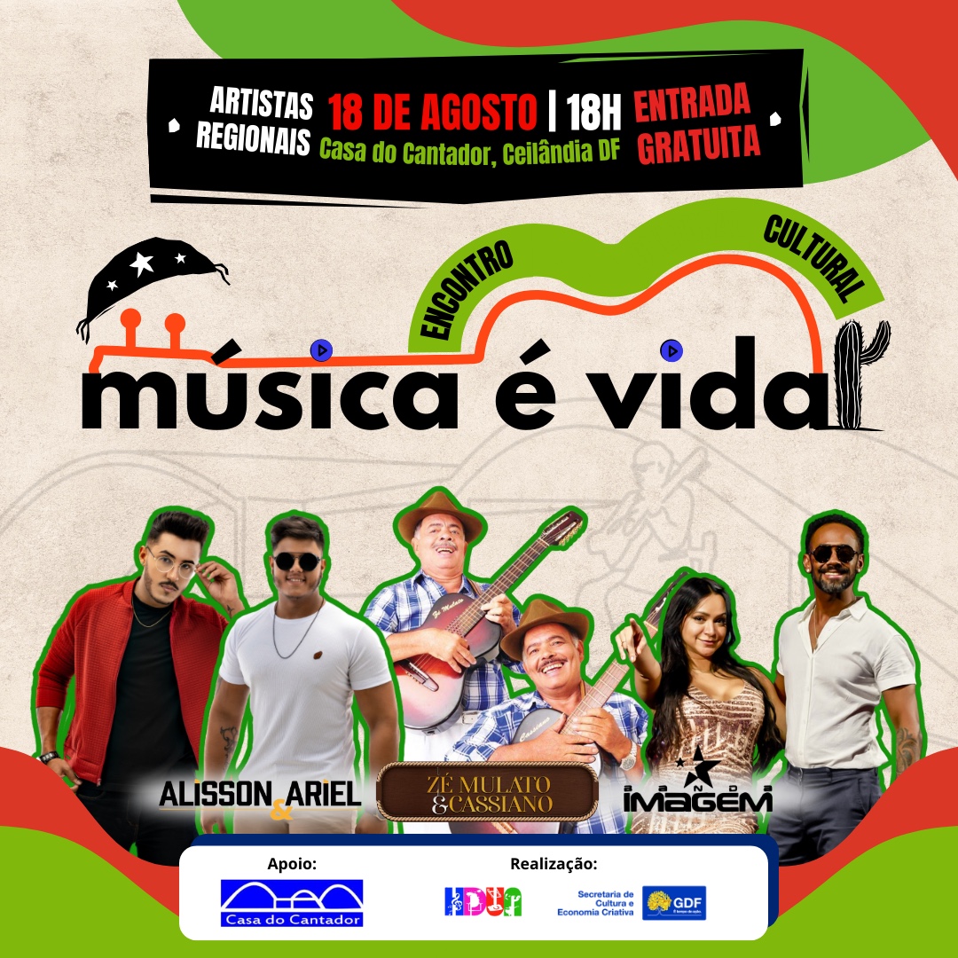 Neste domingo (18), a Casa do Cantador recebe o Encontro Cultural: Música é Vida. A ação toma o Palácio da Poesia para uma série de atrações musicais com artistas renomados do cenário local e nacional. Organizado pelo Instituto Sociocultural Humanidade Diversificada e Unida (HDUN), com o apoio da Secretaria de Cultura e Economia Criativa do Distrito Federal (Secec), o evento, marcado para começar às 18h, contará com shows gratuitos de Alisson e Ariel, Zé Mulato e Cassiano e Banda Imagem e artistas locais.