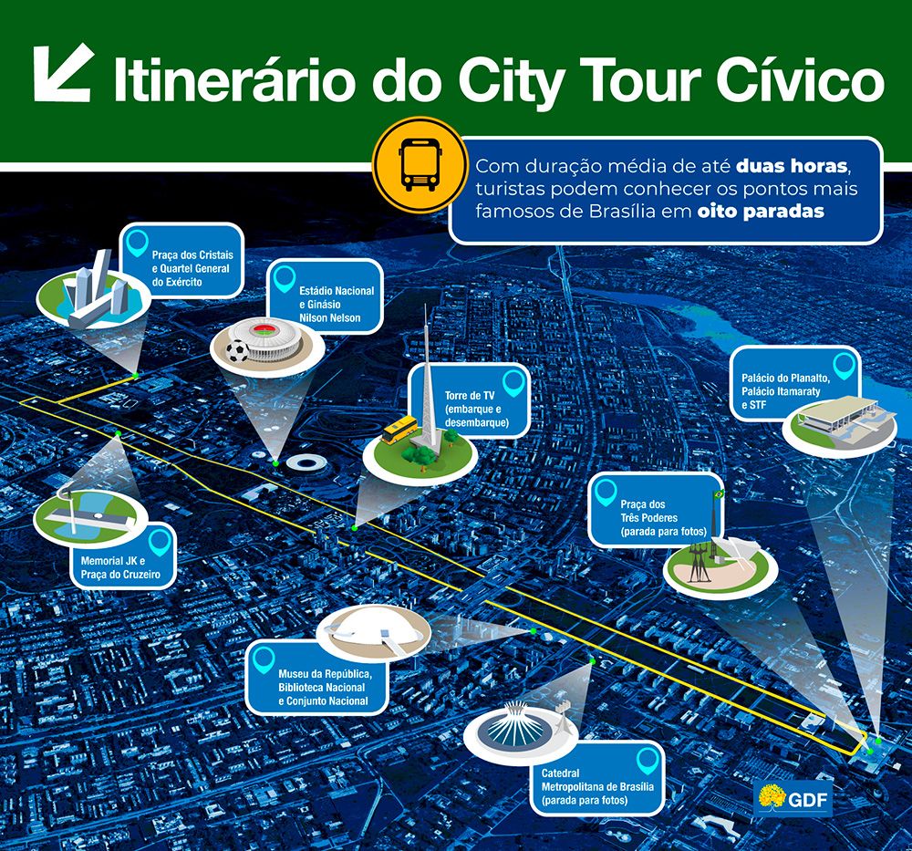 O roteiro, com duração de 1h30 a 2h, parte do Eixo Monumental e percorre pontos como o Setor Militar Urbano, a Esplanada dos Ministérios, a Catedral, o Congresso Nacional e a Praça dos Cristais, sempre com o acompanhamento de guias profissionais. Os ônibus são acessíveis e cadastrados no Cadastur. As viagens ocorrem de terça a domingo, com horários ampliados nos fins de semana e feriados. Os ingressos devem ser agendados previamente no site da Brasília Receptivo, com possibilidade de encaixe conforme a disponibilidade.
