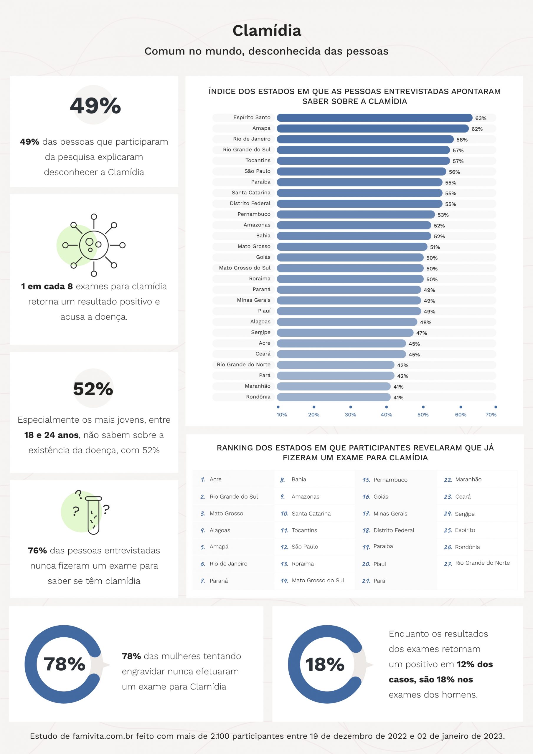 As informações por Estado, deram conta que o Espírito Santo é a localidade em que mais pessoas têm ciência acerca da Clamídia, com 63%, seguida pelo Amapá, com 62%. Rio de Janeiro, São Paulo e Distrito Federal aparecem nesse ranking com 58%, 56% e 55%, respectivamente. Já Maranhão e Rondônia empataram, com 41% respondendo saberem a respeito dos perigos da Clamídia.