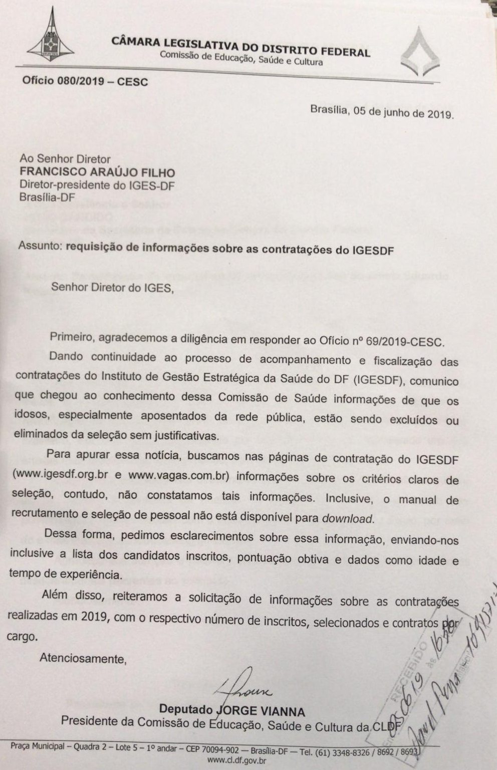 Para tomar iniciativas em relação ao processo seletivo do IGESDF, o presidente da CESC requereu do instituto, o envio de uma lista contendo a relação dos candidatos, com a pontuação obtida, além de informações, a exemplo da idade e tempo de experiência de todos os inscritos. Vianna solicitou ainda dados sobre as contratações efetivadas ao longo de 2019, bem como o número de inscritos, selecionados e contratos por cargo.