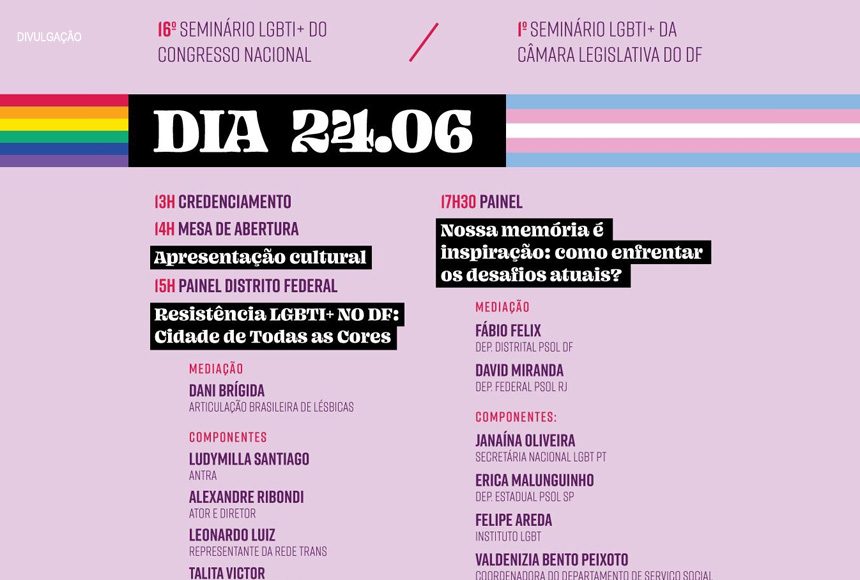 A programação inclui mesas temáticas, apresentações culturais e debates. O encontro terá início às 14h, no auditório da CLDF, com abertura oficial e saudação das autoridades presentes. Em seguida, terá início o painel sobre os desafios do Distrito Federal no que diz respeito à temática LGBTI+. Finalizando a rodada de debates, serão relembradas as principais lutas do movimento, da Ditadura aos dias atuais.