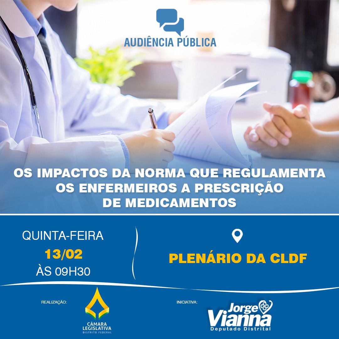 A Câmara Legislativa do DF (CLDF) realiza, na quinta-feira (13), às 9h30, audiência pública sobre os impactos da norma que regulamenta os enfermeiros à prescrição de medicamentos, a ser realizado no Plenário da CLDF. De iniciativa do deputado distrital, Jorge Vianna, o evento tem por objetivo, discutir a revogação da Portaria nº 67/2020, Secretaria de Estado de Saúde do DF (SES-DF), que suspendeu os efeitos da Portaria nº 33/2020. Essa última concedeu, a esses profissionais, a autorização para prescrever remédios e solicitar exames.