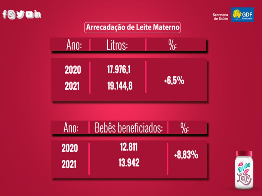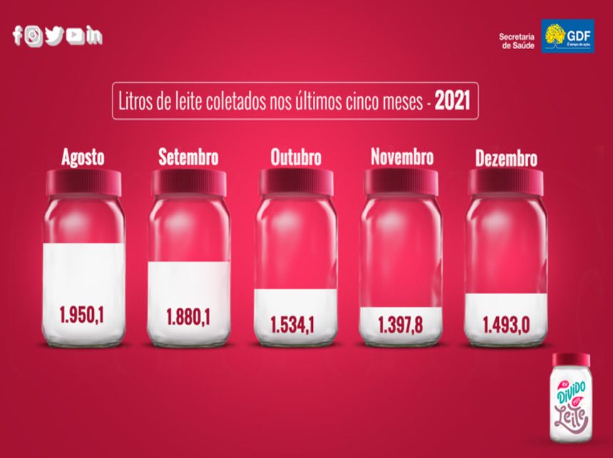 Mesmo diante do cenário de pandemia ao longo de 2021, o ano foi muito positivo para os estoques do Banco de Leite Humano (BLH) do Distrito Federal. Ao longo dos 12 meses, foram coletados 19.144,8 litros de leite materno, 6,5% a mais do que em 2020, quando a arrecadação somou 17.976,1 litros.
