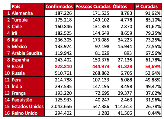 Dentre esses os 16 países com mais de 100 mil casos registrados positivos, dados da JHU apontam que, em termos percentuais, Alemanha, com 187.226 casos confirmados, e 8.783 óbitos, tem um índice de recuperação de 91,62%, equivalente a 171.525 pessoas recuperadas. Na sequência ainda seguem a frente, Turquia (85,10%), Chile(81,67%), Irã (79,25%), Itália (73,25%), México (72,55%), Arábia Saudita (67,56%) e Espanha (61,78). O Brasil, ocupa a nona posição com recuperação de 53,69%.