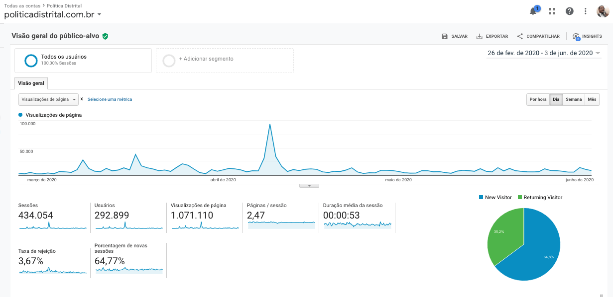 Com o início dos casos de Covid-19 no DF, em 26 de fevereiro, PD registrou um aumento de leituras de matérias. Ao todo, 1.07 milhão de publicações foram lidas, por um total de 2,92 mil pessoas, equivalente a 35,2%, com média de 2,47 matérias por cada acesso. Nesse período 152,8 mil pessoas são leitores fidelizados do site. Porém, 281,2 mil (64,8%) foram de novos leitores.