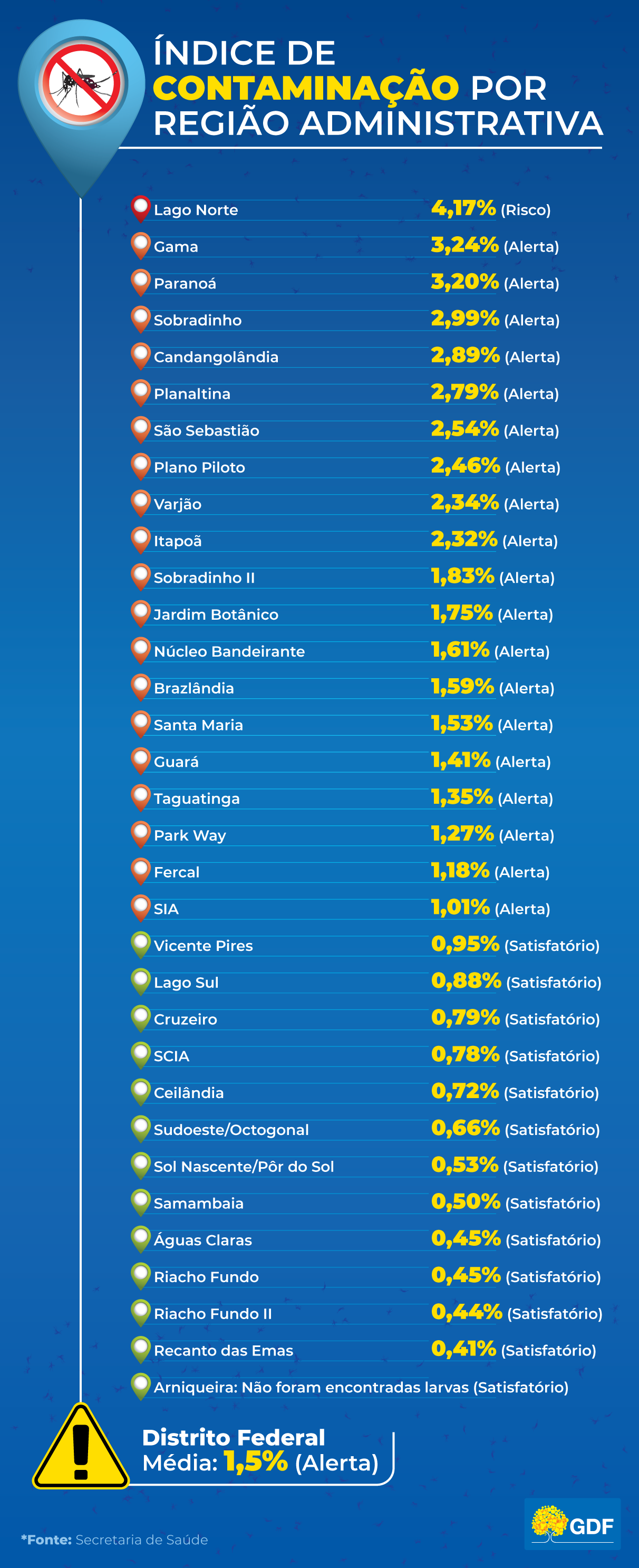 O LIRAa no DF foi realizado entre 9 e 13 de janeiro em 27.001 imóveis das 33 regiões administrativas e revelou que 1,5% deles apresentavam larvas do mosquito. Dividindo por RAs, o Lago Norte atingiu um índice de 4,17%, já dentro da margem classificada como risco. Outras 19 cidades ficaram com infestações entre 1% e 3,9%, no grau de alerta. Em 13 RAs, o índice de infestação ficou abaixo de 1%, considerado satisfatório. Em Arniqueira, não foram identificadas larvas.