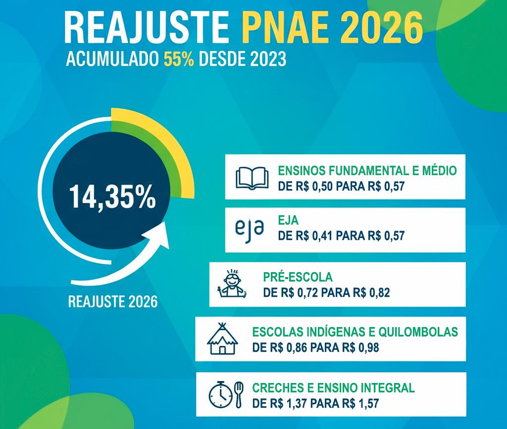 O Governo do Brasil, através do Ministério da Educação (MEC) e do Fundo Nacional de Desenvolvimento da Educação (FNDE), reajustou em 14,35% os valores por pessoa do Programa Nacional de Alimentação Escolar (PNAE) para o ano de 2026. Anunciada nesta segunda-feira (09/Fev) em Mauá, São Paulo, a medida visa recompor o poder de compra e assegurar a qualidade nutricional das mais de 50 milhões de refeições diárias destinadas a crianças e jovens em escolas públicas de todo o país. O reajuste foi calculado com base na inflação acumulada entre 2023 e 2025, medida pelo Índice Nacional de Preços ao Consumidor Amplo (IPCA), e já é válido para a primeira parcela de repasse aos estados e municípios.