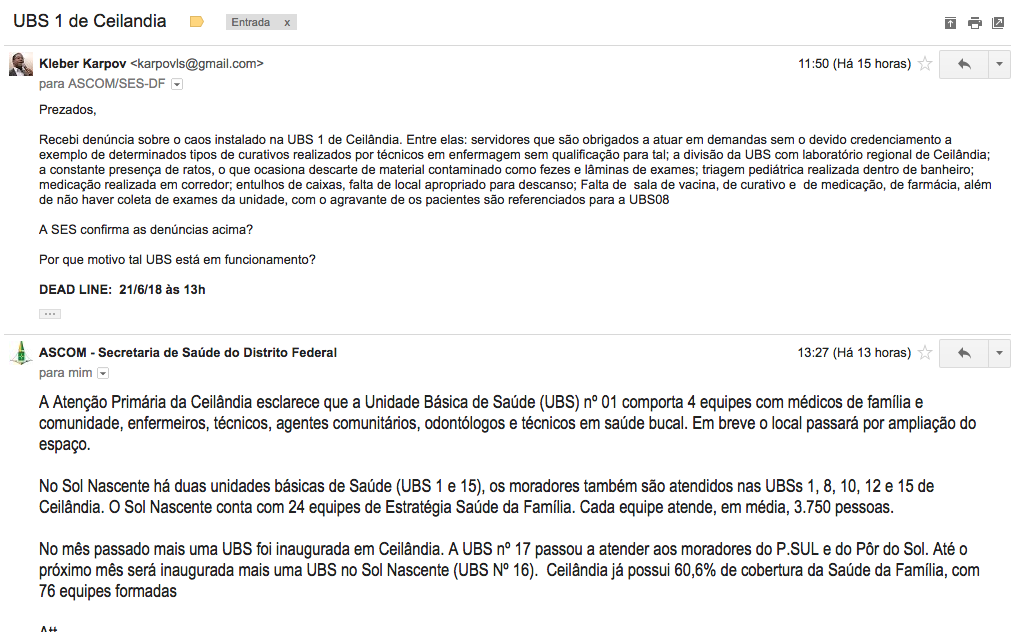 Questionada sobre os diversos problemas relatados pela servidora, salvo informar que “em breve o local passará por ampliação do espaço”, a Pasta se limitou a fazer uma série de propagandas, ao mencionar a quantidade de UBS em Ceilândia, de equipes compostas e população atendida, porém, sem abordar os questionamentos em relação à UBS 01 de Ceilândia Norte.