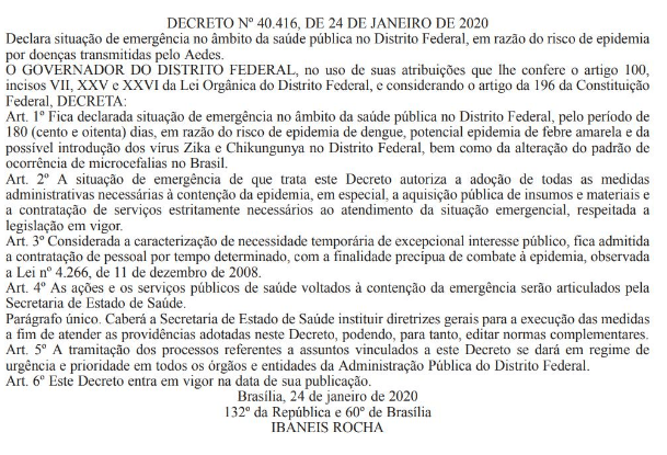 O governador do DF, Ibaneis Rocha (MDB), decretou nesta sexta-feira (24), situação de emergência na Saúde Pública do DF, em período de 180 dias. O motivo é o o risco de epidemia de dengue e, potencialmente, de febre amarela, de possível introdução do vírus Zika e Chikungunya no DF, além da alteração do padrão de ocorrência de microcefalias no país.