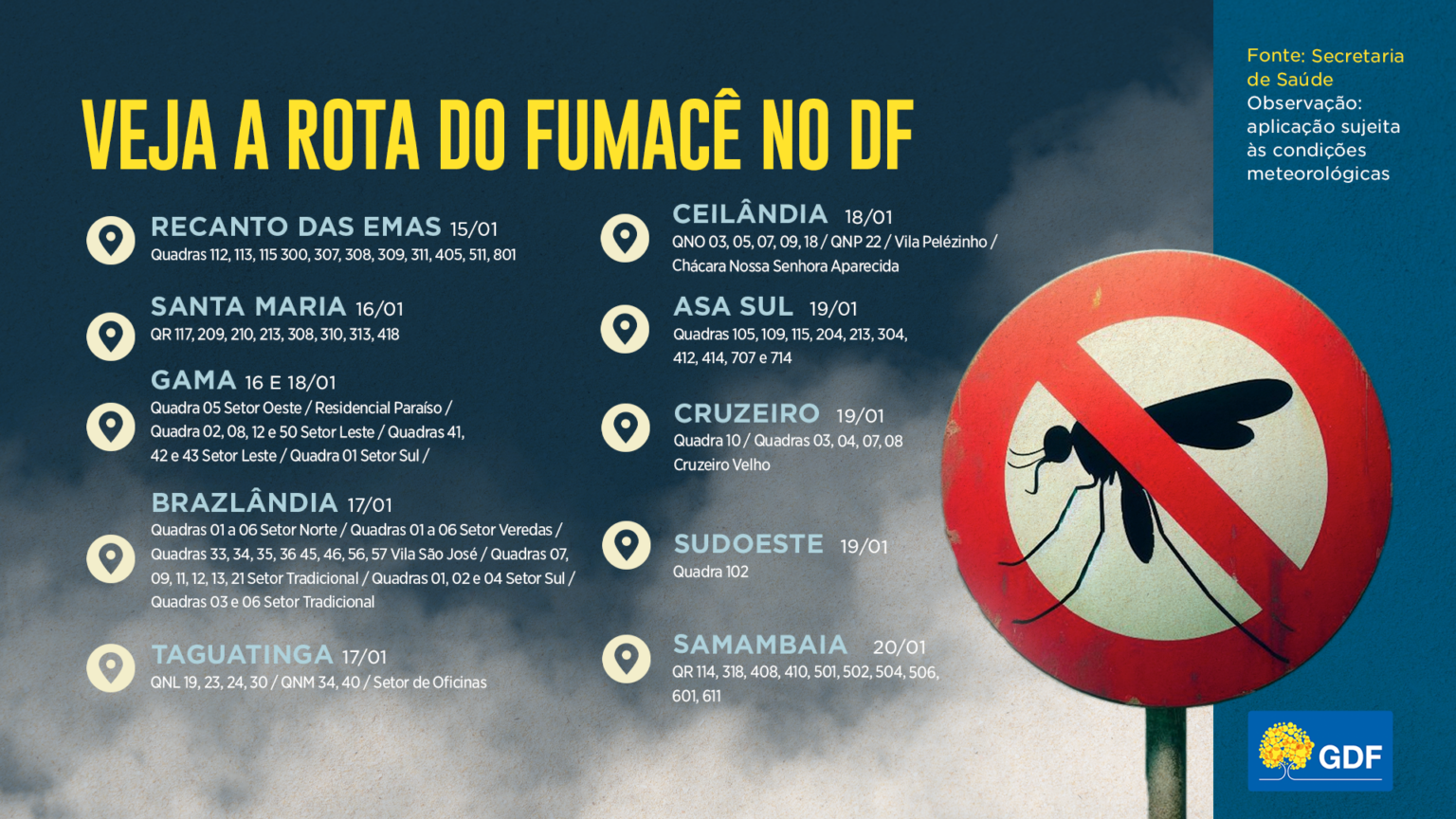 Em Brazlândia, uma das cidades com maior número de casos no DF, o fumacê será aplicado nas seguintes quadras: 1 a 6 do Setor Norte; 1 a 6 do Setor Veredas; 33, 34, 35, 36 45, 46, 56, 57 da Vila São José; 7, 9, 11, 12, 13, 21 do Setor Tradicional; 1, e 4 do Setor Sul; e 3 e 6 do Setor Tradicional.