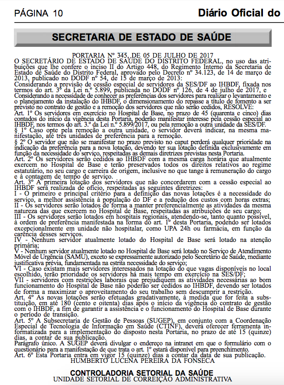 Por meio de publicação da Portaria nº 345/2017, no Diário Oficial do DF (DODF)(6/Jul), Fonseca concedeu um prazo de 45 dias para os servidores da SES-DF manifestarem o interesse de deixar ou permanecerem no HBDF. O prazo deve ser contato do início da validade da portaria, que entrará em vigor em 15 dias.