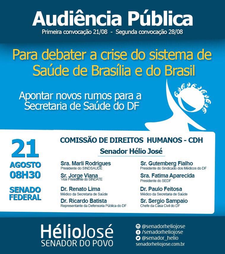 A Comissão Direitos Humanos e Legislação Participativa (CDH) do Senado Federal, realizará, na manhã de sexta-feira (21/Ago), às 8h30, a primeira etapa da Audiência Pública para debater a crise do sistema de Saúde em Brasília e no Brasil.