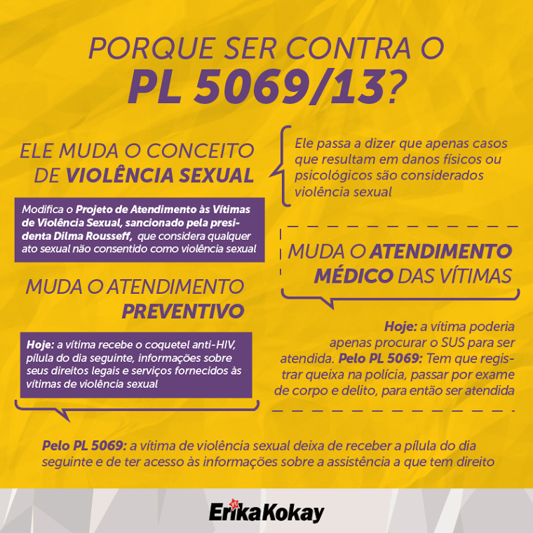 A proposta é considerada por Ekika um “retrocesso”. “As vítimas da violência sexual já enfrentam uma dor inimaginável. Propõe uma via crúcis para que as mulheres possam comprovar a violência sexual, permite a omissão do socorro, já que deixa o profissional de saúde sem poder atender as vítimas de forma emergencial”, aponta. Kokay ressalta também que o projeto vai contra o Programa Mulher: Viver sem Violência, que permite o atendimento humanizado a vítimas.