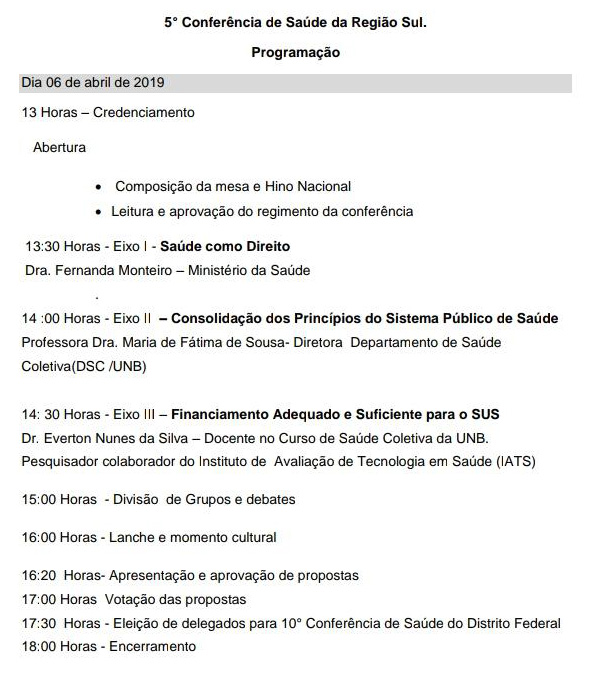 Sábado (6/Abr), é o dia da Região Sul, que compreende as RAs Gama e Santa Maria realizarem a conferência regional, no auditório da UniCeplac, no Setor Leste Industrial do Gama.