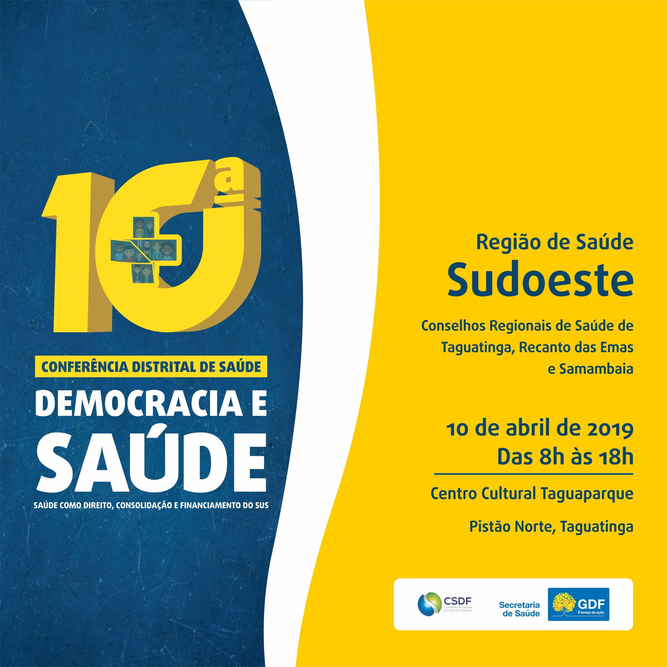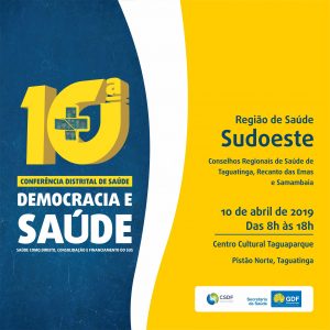 Segunda-feira (10/abr), a região Sudoeste, das RAS Taguatinga, Samambaia e Recanto das Emas, realizam a conferência de saúde, das 8h às 18h, no Centro Cultural Taguaparque, no Pistão Norte de Taguatinga.
