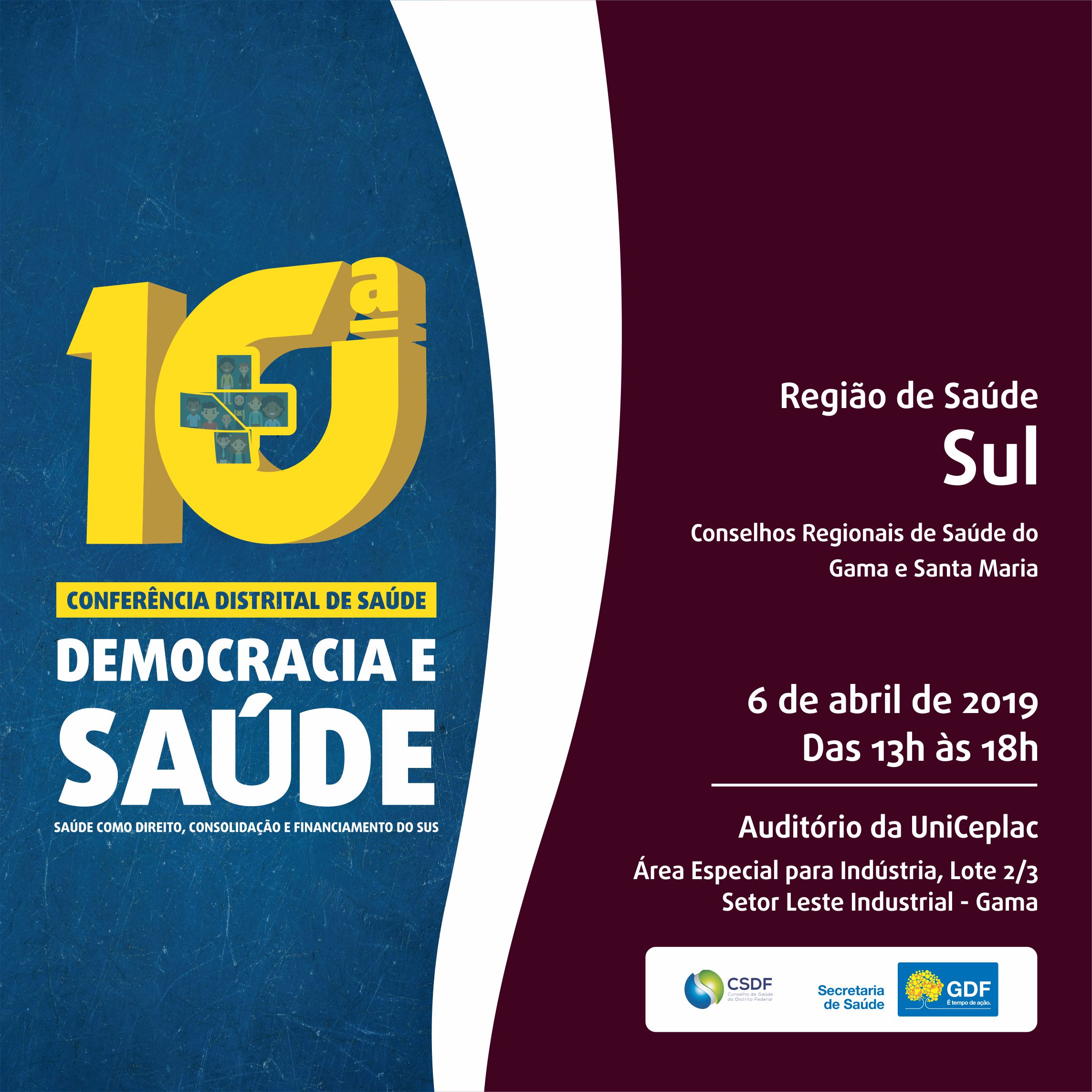 Sábado (6/Abr), é o dia da Região Sul, que compreende as RAs Gama e Santa Maria realizarem a conferência regional, no auditório da UniCeplac, no Setor Leste Industrial do Gama.