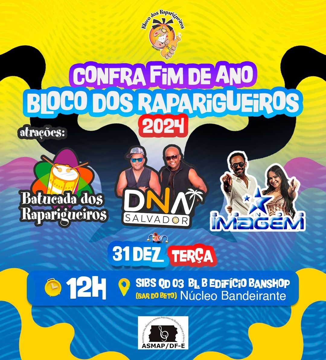 A Diretoria do Bloco dos Raparigueiros tem o prazer de convidar seus foliões para a tradicional confraternização de fim de ano. Celebre conosco a chegada de um novo ano com muita folia e já entrando no clima do Carnaval 2025.