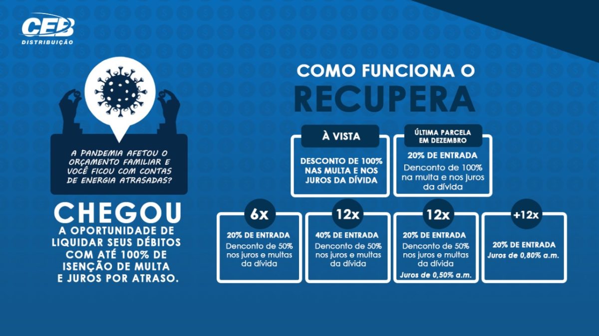 No mês de junho, a CEB Distribuição lançou uma edição excepcional do Programa de Recuperação de Créditos (Recupera). Clientes que enfrentam dificuldades para manter o pagamento da conta de energia em dia, em razão da pandemia de Covid-19, agora terão até 31 de agosto para quitar as dívidas em condições diferenciadas.