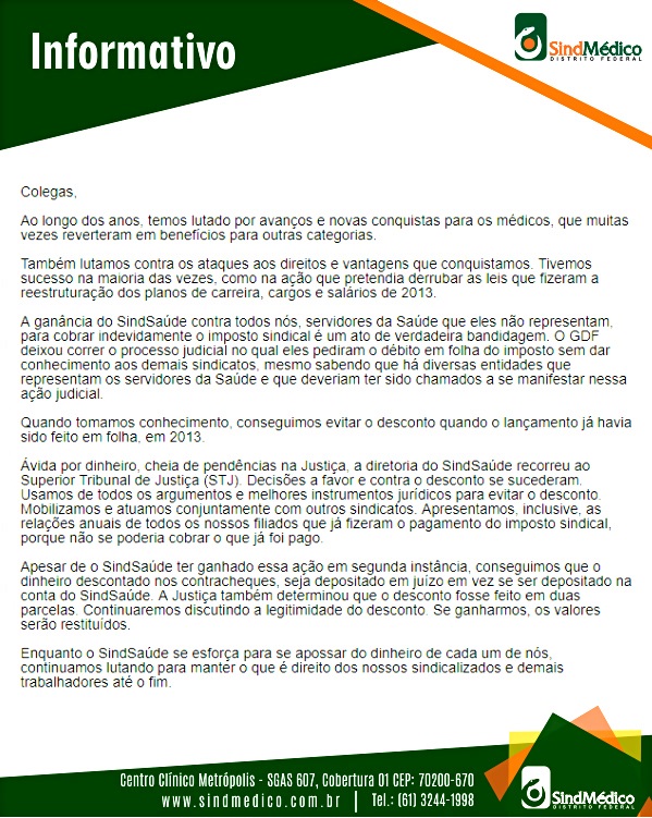 Por meio de nota e de um vídeo dirigido aos médicos do DF, o presidente do Sindicato dos Médicos do DF (SINDMÉDICO-DF), Gutemberg Fialho, engrossou o tom em relação ao desconto do imposto sindical, por força de ação ajuizada pelo Sindicato dos Empregados em Estabelecimento de Saúde do DF (SINDSAÚDE-DF). O Sindicalista observa que permanece no embate jurídico para tentar reverter e devolver os valores descontados à classe médica.