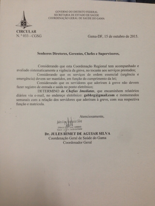 Um servidor do Hospital Regional do Gama encaminhou ao Política Distrital, cópia de uma circular direcionada aos diretores, gerentes chefes e supervisores da Coordenação Geral de Saúde do Gama, publicada na quinta-feira (15/Out), determina às chefias imediatas que encaminhem relatórios diários por e-mail, além de memorandos semanais com relação a adesão dos servidores à greve da Saúde. O documento pede anda que seja encaminhado a função e a matrícula do servidor grevista.