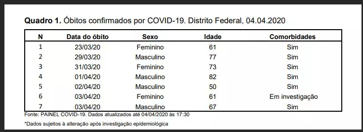 Até o momento, são sete mortes confirmadas por coronavírus no DF. Durante a madrugada desse sábado (04/04), foi confirmado o óbito de um homem de 67 anos, morador do Plano Piloto. Ele era diabético e hipertenso e estava internado desde o último dia 26 de março no Hospital Santa Lúcia, localizado na Asa Sul. A Secretaria de Saúde não confirmou o nome da vítima.