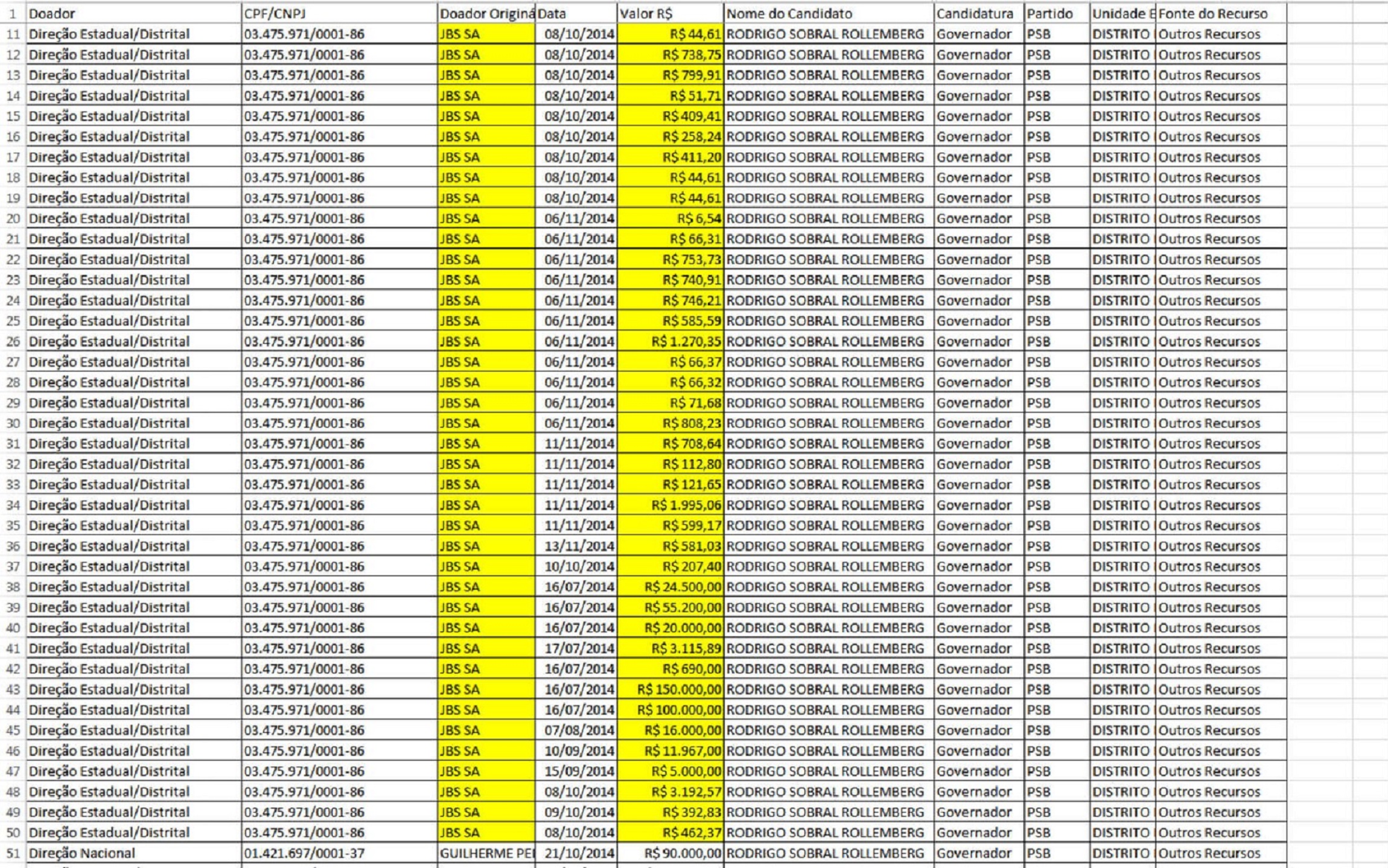 Na prestação de contas apresentada por Rollemberg, ao Tribunal Superior Eleitoral (TSE), o maior volume repassado, R$ 450 mil, aparece como doação direta da JBS. O restante da grana, R$ 402.831,75, foi repassado pela direção do PSB-DF à campanha de Rollemberg em 40 transações atípicas apontadas pelo guardião da Receita Federal.