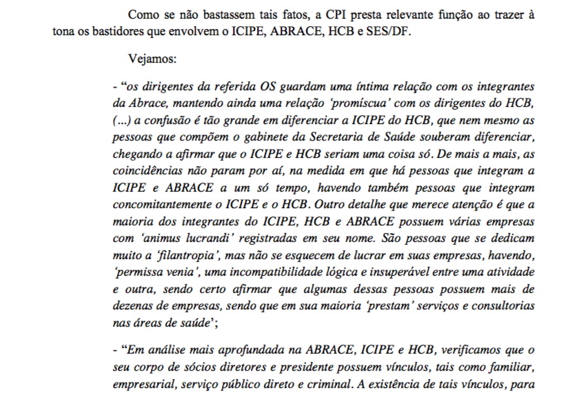 Aliado a isso, a outra ação do MPDFT que atingiu o governo Rollemberg foi ajuizada contra ex-gestores da SES-DF, além do Instituto do Câncer Infantil e Pediatria Especializada (ICIPE), Organização Social (OS) responsável pela administração do HCB, entidade condenada pelo Tribunal de Justiça do DF e Territórios (TJDFT), no final de 2017, em relação à gestão do HCB.