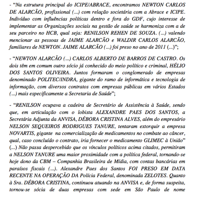 Na representação, com informações de irregularidades cometidas na Saúde, na gestão de Rollemberg, o MPC-DF, resgatou, desde habilitação do ICIPE enquanto Organização Social (OS)(2011), na gestão do ex-governador do DF, Agnelo Queiroz (PT) e obteve informações reveladores.