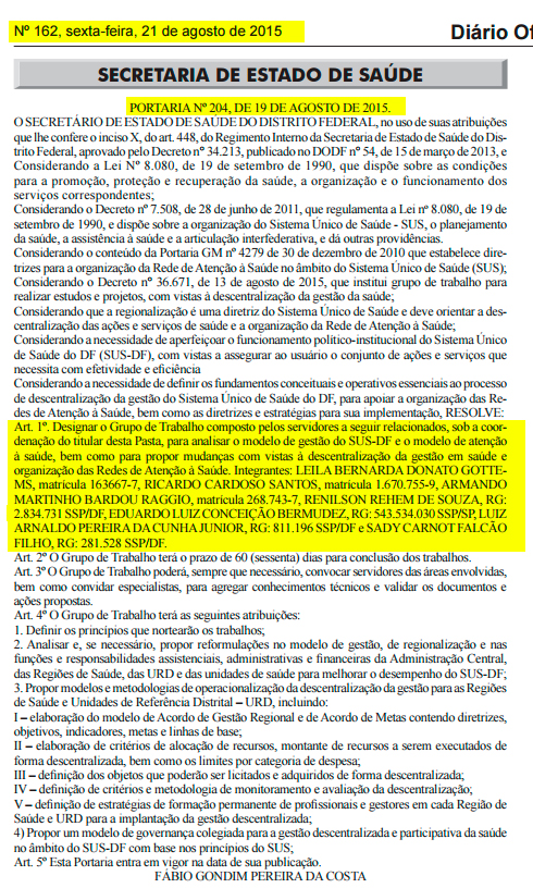 Uma delas, a nomeação de Renilson Rehem de Souza, então diretor da OS e superintendente do HCB, na condição de membro de grupo de trabalho da SES-DF, como se pertencesse aos quadros da Secretaria de Saúde. Tal nomeação foi realizada por Rollemberg, por meio da Portaria no 204/2015, publicada no Diário Oficial do DF, em 21 de agosto de 2015, caso denunciado por Política Distrital (PD).