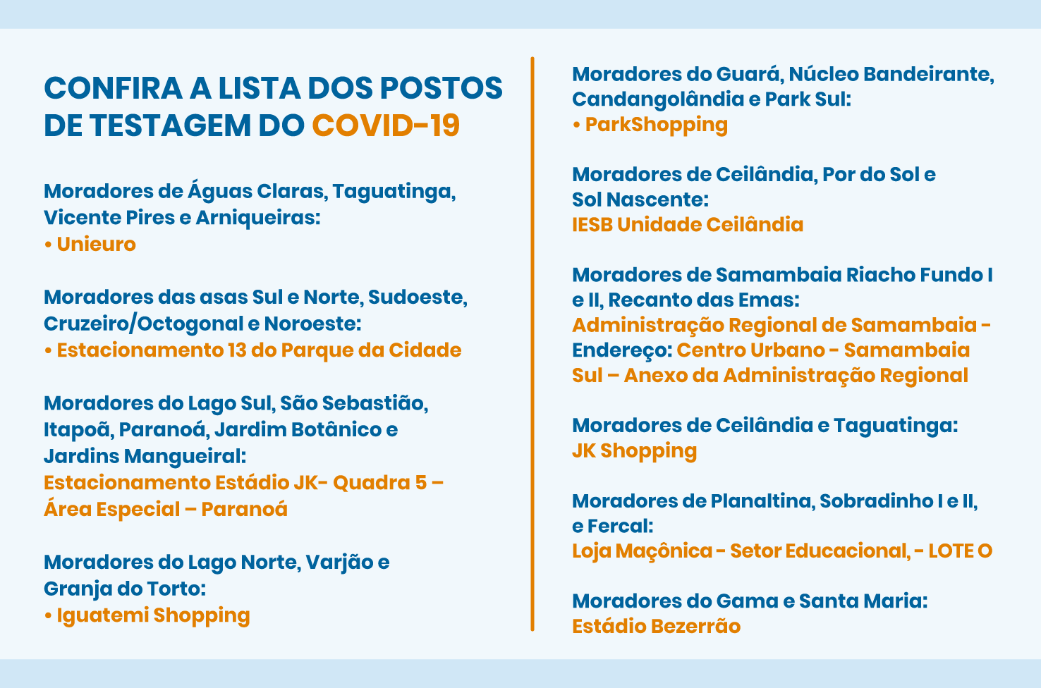 Para fazer o exame, o cidadão deve agendar atendimento pelo site testa.df.gov.br ou pelo aplicativo e-GDF. O resultado é enviado para o e-mail cadastrado na plataforma. No site é possível obter a informação de quantas vagas cada local possui. O drive-thru é exclusivo para pessoas sintomáticas ou que tenham histórico de contato com algum caso confirmado e residam com idosos, e que moram nas regiões administrativas abrangidas pelo local onde o posto está montado.