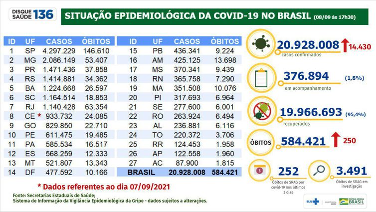 As autoridades de saúde no Brasil registraram, desde o início da pandemia, 20.928.008 pessoas infectadas pelo coronavírus. Em 24 horas, foram confirmados 14.430 novos diagnósticos positivos.