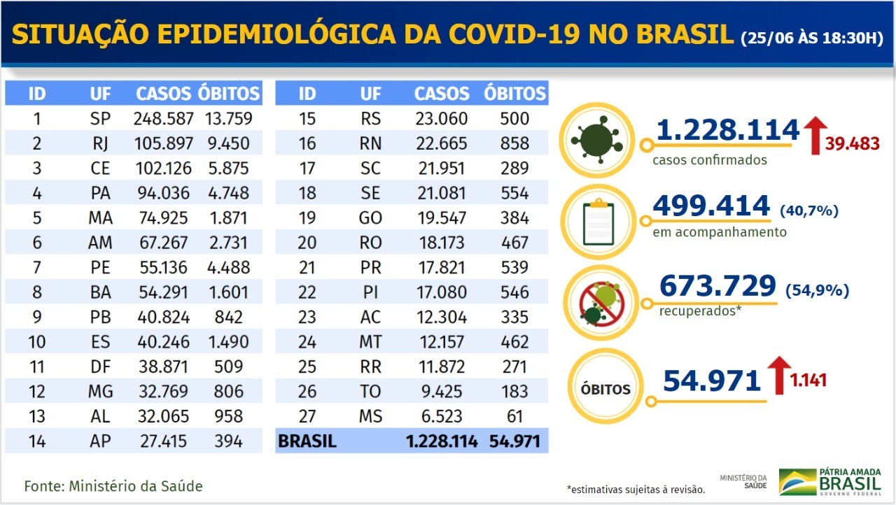 O balanço também teve 39.483 novos casos registrados, totalizando 1.228.114. O acréscimo de pessoas infectadas marcou uma variação de 3,3% sobre o número de ontem (24), quando os dados do ministério registravam 1.188.631 de pessoas infectadas.