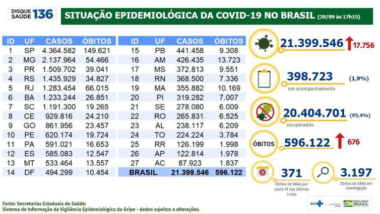 Com os novos óbitos, a soma de pessoas que perderam a vida para a doença alcançou 596.122 pessoas.
